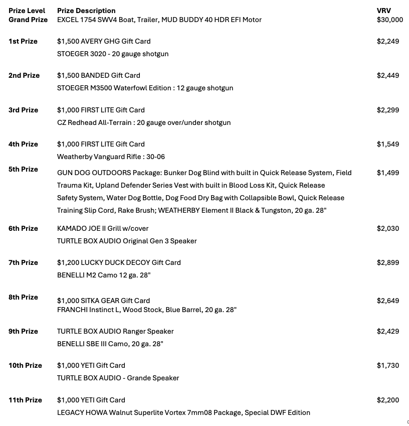 3. CONSUMER DISCLOSURES: No purchase necessary. You have not yet won. Ends 12/12/25. Twelve (12) prize winners will be drawn. Maximum value of all prizes: up to $53,982. Odds of winning a prize depend on the total number of eligible entries received, estimated at 1:1,496. Limit: One prize per person. SPONSOR: Delta Waterfowl Foundation, 1412 Basin Ave., Bismarck, ND 58504.