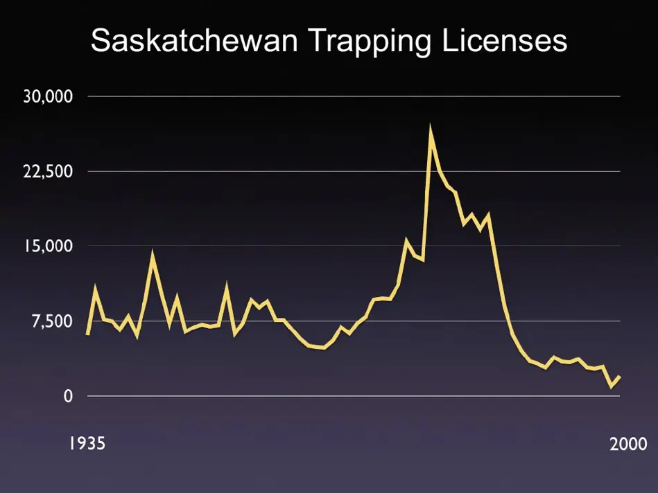 Fur trapping north of the border has also declined precipitously. In Saskatchewan, from a mid-20th century peak of more than 25,000 licensed trappers, trapping license sales declined to fewer than 2,000 by the millennium.